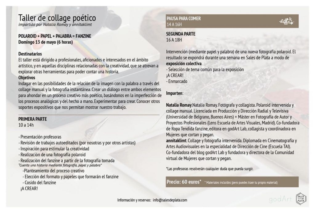 Taller impartido el 13 de mayo de 2018 junto a la fotógrafa Natalia Romay en Sales de Plata (Madrid).
